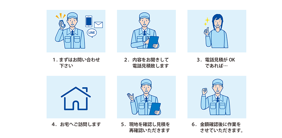 出張前に専門スタッフがお見積致します。お見積りに納得いただけましたら現地にお伺い致します。